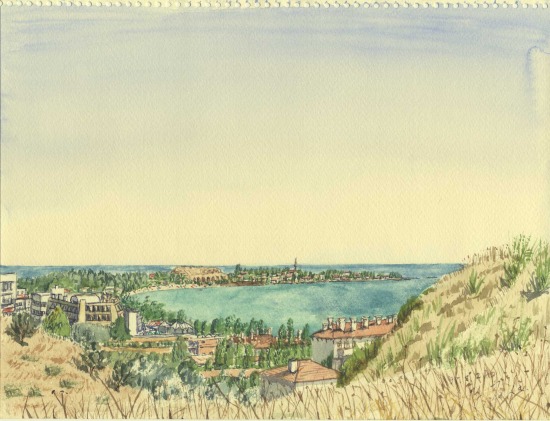 幹線から折れてエドレミット湾北岸の田舎道をたどった。昨夏にはこのあたりで、たった一人で海水浴したことを思い出した。道と浜の間の幅の狭いオリーブ 園を抜けて、自転車を浜に降ろした。まだ10時前だが食事にした。食後、スケッチする。