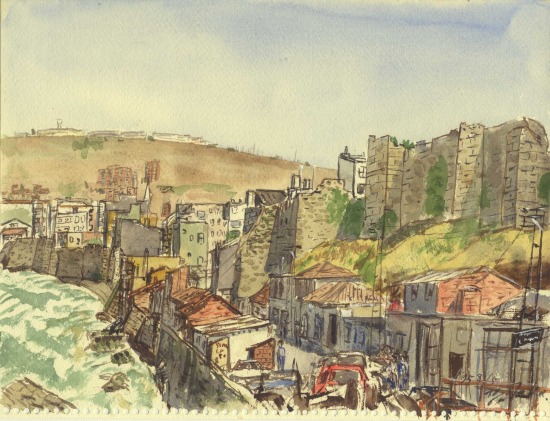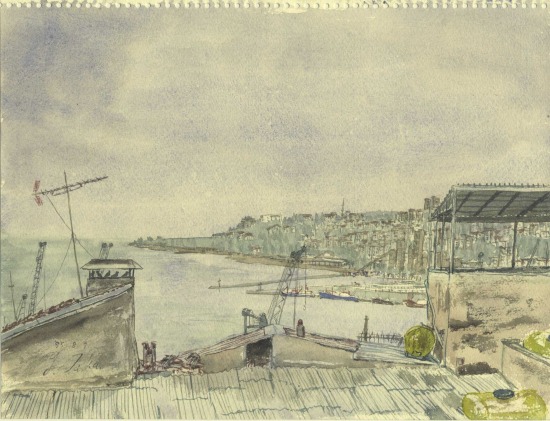 このあたり、東部黒海岸は雨が多い。トラブゾンは雨がよく似合う。泊まっている安ホテルの部屋の前のテラスからスケッチする。鳩も煙突の傘の下で雨宿りしている。
