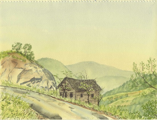海岸線の幹線を離れて、わざわざ山の中の迂回路をたどった。廃屋をスケッチする。以前は岩を廻って小屋の前を道が走っていたようだが、いまは切り通しになって道は直行している。