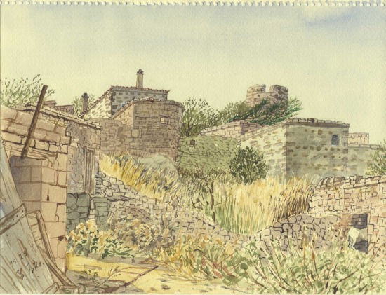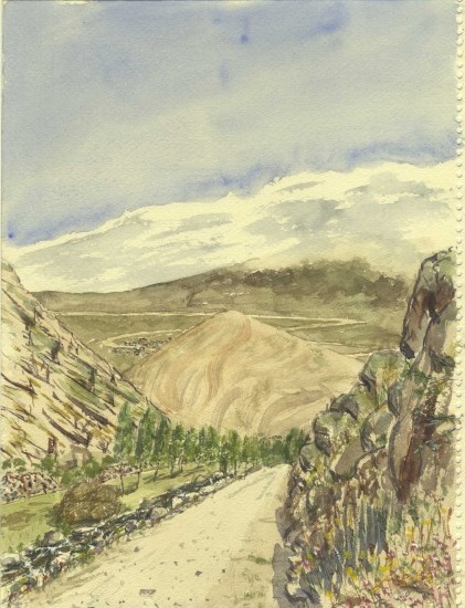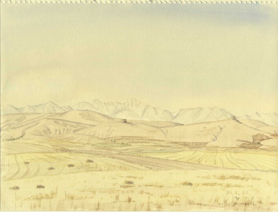 野宿のテントを片付けて、早朝にスケッチ。朝日の中で遠くの山襞がよく見える。刈り取り後の麦畑が、これから越していくなだらかな丘陵へと続いて広がっ ている。硬くて侵食され残った岩を頂く岡は、女性の乳房のように見える。その背後にトロス山系の一部、ボルカル山脈が屹立している。標高3000mを越す 山々が雪渓を抱いて連なっている。このやまあい山間を縫って入り、山脈を越して地中海岸に出るのだ。