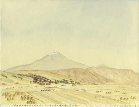 昨夏には室内に泊めてもらったが、今回はテントを張らせてもらっているレストランのテラスに座り込んでのスケッチ。夜明けから、街を背景にするイシャク パシャ宮殿(17世紀クルド人王による)を見降ろして。