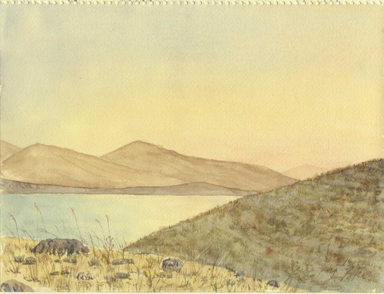 翌朝、夜明けに起きだしてスケッチした。 (この後、この地方に大地震があり、被害の大きさが報道されていた。ワン市内の光景は大きく変わったかもしれない。しかし、このワン湖の姿は変わらないだろう。)