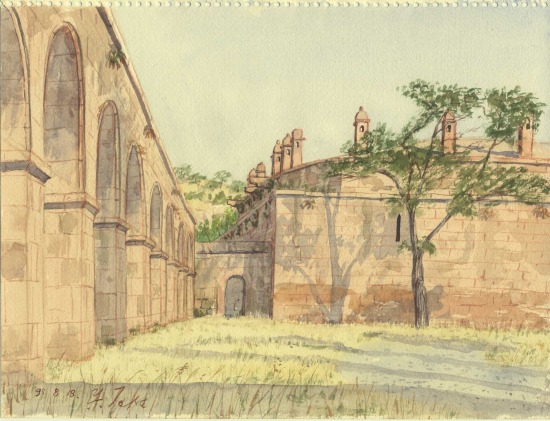 前年から修復工事でとっ散らかっていた宮殿は、今なお工事中。工事はかなり進んで、真新しい石材を きれいに積んだ部分がさらに広がっている。今回スケッチするに当たり、この新しい石材部分はすべて省き、無いものとして画面構成する。