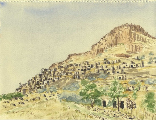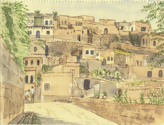 集まってきた子供達の言葉の中に、「キリセ」が聞き取れた。これらの穴居を基にした住居群はキリセ、つまりキリスト教徒が作り始めたものなのだろう。 あまりに子供達が騒ぐので、ついついこちらも悪態が口に出てくる。これは悪童どもに火を注ぐようなもので、ますます騒ぎがひどくなった。近所のオバハンが出てきて、私に立ち去れという。スケッチ途中だったがそそくさと画材を片付けた。 (これは帰国後に加筆して体裁を整えたスケッチである。)