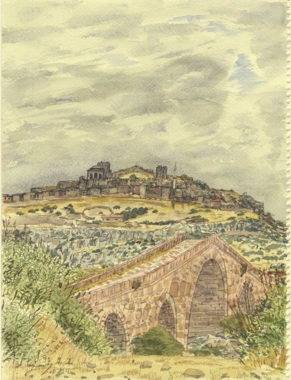 典型的なイスラム様式の、古びた石橋越しに村を北からスケッチする。