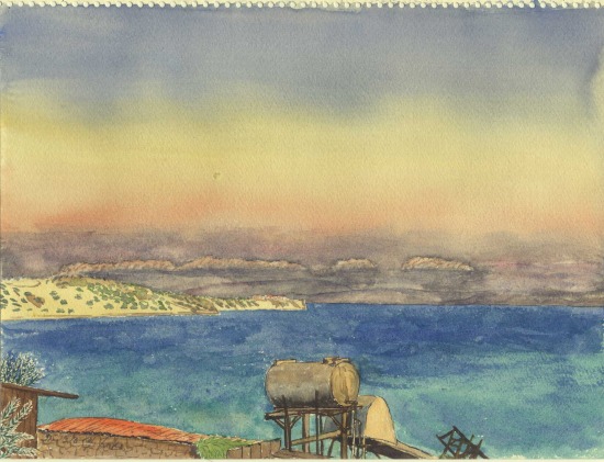 霞んで見えるのはレスボス島の島影。ギリシャ領なのだろう。 聞こえるのは波の音、遠くにときたまの子供の声、そして風の音。風に揺られて落下したオリーブの実がパレットに当たって大きな音を立て、驚かされる。