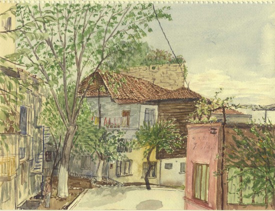 イスタンブール旧市街のスルタンアフメット地区には、若者向けホステルや安宿が集中している。私が泊まっている安宿の建つ路地突き当たりから、一段下の 路地をスケッチする。 トプカプ宮殿を取り囲む城壁かやぐら櫓の一部が覗いている。もっとも、この一角は軍隊の駐屯地か兵学校に使われているようだったが。