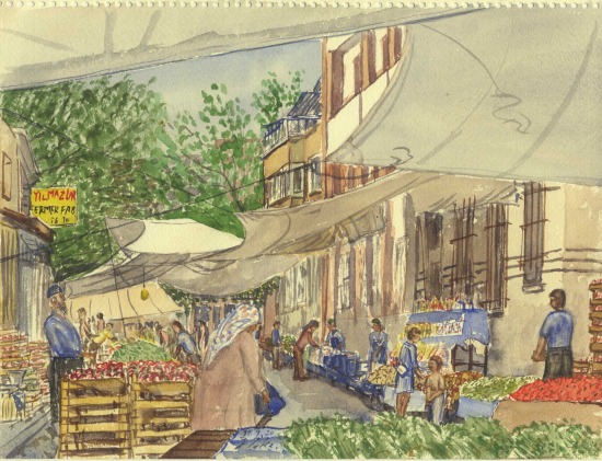スケッチするこの人通りの少ない通りには、カーペット屋が2軒並んである。小さいほうの店で、私はキリムとカーペットを買った。ここから日本へ送っても らったのだが、店主の親父は汗だくの大変な苦労をしたのだった。というのは、国外持ち出し制限がかかるほどの価値がこの古カーペットに無い、という証明を 博物館から取ってこねばならず、親父は重いカーペットを持って、博物館や郵便局との間を走り回ったのだ。