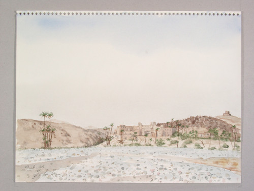 サハラ砂漠に近く、ワルサザードとエラチディアを結ぶ道はカスバ街道と呼ばれる。乾き切った熱暑の道をたどって、幾つものカスバ(日干し煉瓦でできた城)を見ることができた。涸れ川にかかった橋の下に日影を求めてのスケッチ。