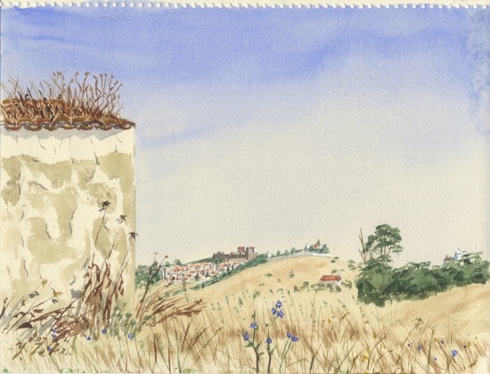 深く繁る草地の中に残る廃屋の陰に夜を過ごした。壁際でドライフラワー状態になった雑草が美しい。右手に風車が見える。古城があり、白塗りされた壁の建物が美しい、ポルトガルの田舎町が遠望される。地図上ではArroiolosと町名が読めた。