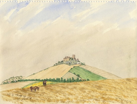 山頂に乗る町、エリーチェ。古城があり、石畳の細道が走る古い街並みが美しい。海と陸とのすばらしい360°の展望を持つ町だった。 ユーカリの木陰に座り込んでスケッチ。麦畑、ブドウ畑、オリーブ畑が広がる。