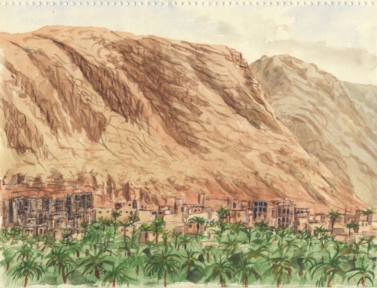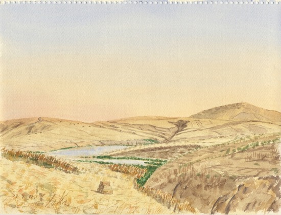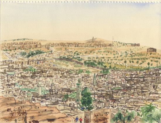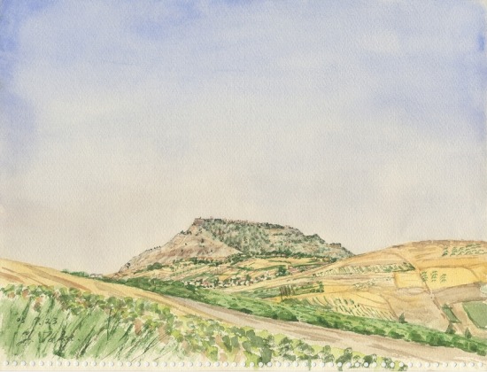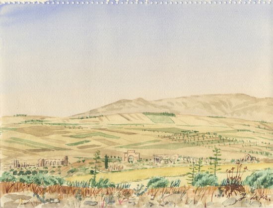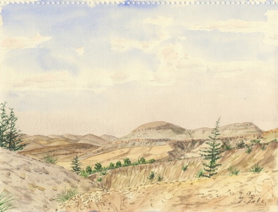 ひからび上がった丘の斜面に生えた、いじけたオリーブの木の下に座り込んでスケッチ。昼過ぎ、モスク(回教寺院)からアザーン(祈祷への誘い)が鳴り渡った。トルコで聞き慣れたものと異なり、かなりへたくそだ。