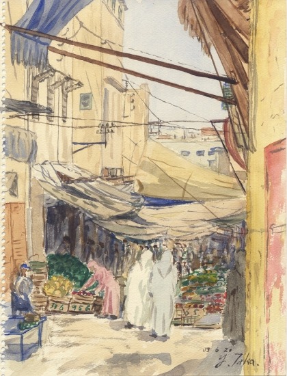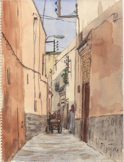 メクネスはモロッコの京都と言える古都。旧ユダヤ人街のこの通りは青果のスーク(商店街あるいは市場)になっている。狭い通路に露 店が並び、人通りでにぎわう。すさまじい人数に囲まれてスケッチしていたが、昼過ぎて昼寝の時間になるとどんどん店はたたまれ、人通りは途切れて静かに なってきた。夕方からは前にも増してにぎやかになるのだろう。