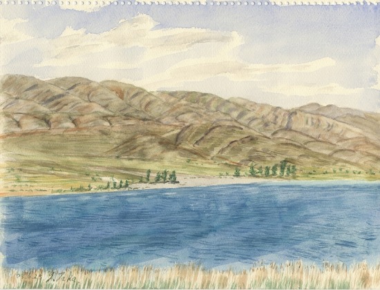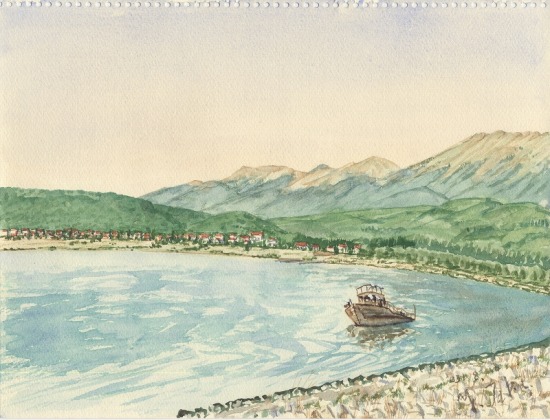 オーリッド湖から標高1600mの峠を越えるとプレスパ湖。2つの湖を隔てる山中に夜を明かし、プレスパ湖岸に下って朝一のスケッチ。マケドニア側からアルバニア側を望む。