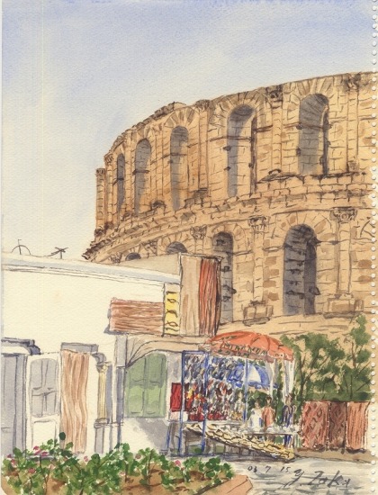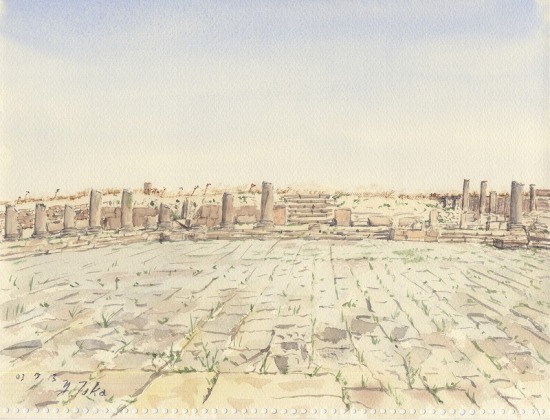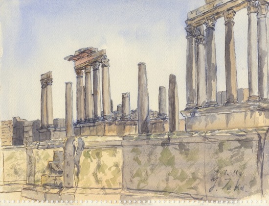 町なかをローマ時代の巨大な遺跡が占めている。カフェの脇に座り込んでスケッチする。コーヒーのよい香りが漂う。画面のみやげもの屋のオヤジがしょっちゅうのぞきにきては、「For me?」を連発する。こっちはただ苦笑を浮かべて首を振るのみだった。