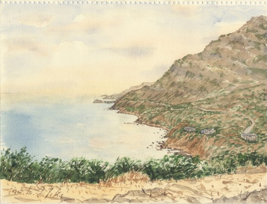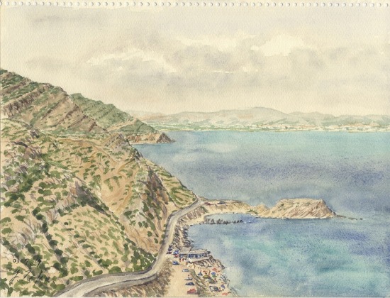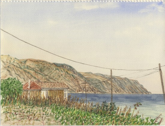 海辺のキャンプ場を出て、画面左の道を登って村を抜け、東に向かった。このカーブを回るともう村を見ることはできない、自転車を停めて村を写生することにした。潅木やブドウ畑、タバコ畑が織り成す山肌の描写に手間取り、終わるのは昼を回った。