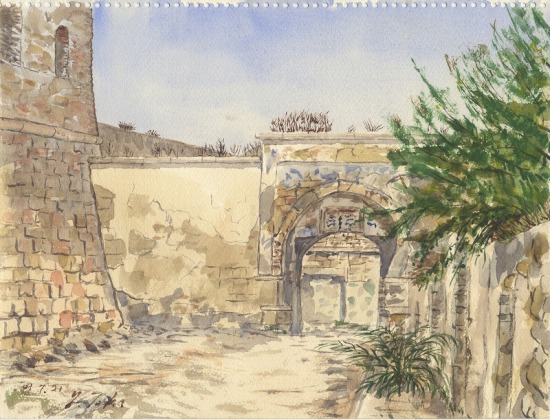シシリー島へ渡る夜行フェリーを待ってのスケッチ。再開発されるのだろう、門の中は取り壊されて更地になっている。元はスーク(市場)だったと思われる。左手は城壁で、城は修築が進められていた。