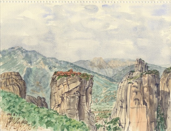 メテオレには奇岩の上に乗っかったり、中腹に引っかかったりの修道院がいくつもある。これはそのうちのひとつ。建造の苦労が思いやられる。 日本人の団体客がきたので、筆を動かしつつ日本語で話を交わした。
