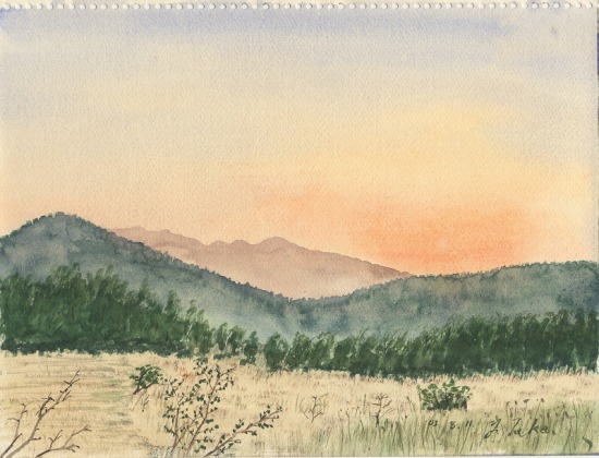 まばらな杉林に入ってキャンプすることにした。夕暮れまでスケッチする。乾ききった荒野に農家がポツリポツリ、はげ山が連なっている。そこにも家畜が放たれている。草の根まで食い尽くしてしまうだろう。