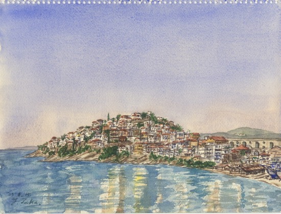 古代からの港町。右手にローマ時代の水道橋も見える。スケッチしている足元は海辺に降りる小道になっていて、たまに避暑客が下る。ドイツ人の男が「トルコで休暇を過ごした帰り。通りかかった、ここ、カバラの美しさに、つい泊まってしまった。」と語っていった。