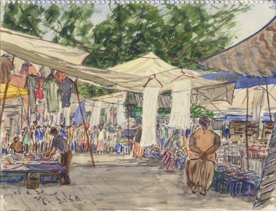 水曜日は宿周りの通りに市が立つ日だ。過去二回と同じポジションで同じ構図のスケッチをする。数年前に比べて店数が減り、店子の掛け声にも力が無く感じられる。