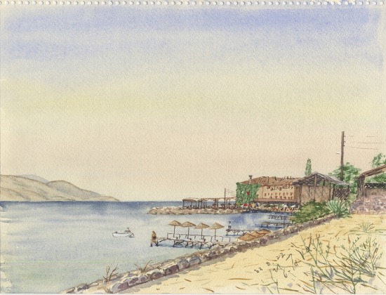 早朝、キャンプ場から浜に下って、スケッチする。水を持ってくるのを忘れたので、海水を汲んでの海水彩画描きになった。左手の島影はギリシャ領レスボス島のもので、点けたラジオから、この島からの放送でギリシャ語が聞こえている。