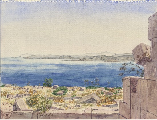 アテナ神殿スケッチの後、古代遺跡の中を見学しながら下って浜を目指した。アゴラ遺跡の中のストア跡をスケッチすることにする。古代の石積みに囲まれて強い海風から逃れることができた。