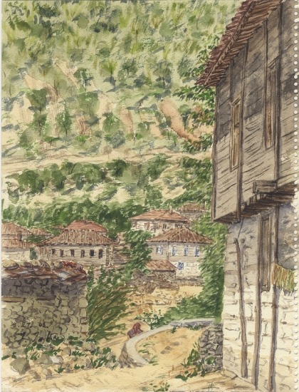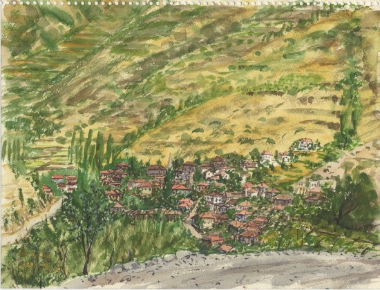 ここはトルコには珍しく水が豊かだ。山肌の豊かに茂った緑を描写するのに苦労する。海まで迫った山地の谷間にあるせいだろう。画面中央にも水場があって、おばさんが洗濯をしている。