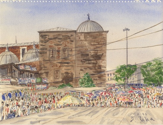 日曜日。ここ、エジプシャンバザールは庶民の市場で大賑わい。Yeniモスクのテラス外壁脇に座り込んでスケッチした。