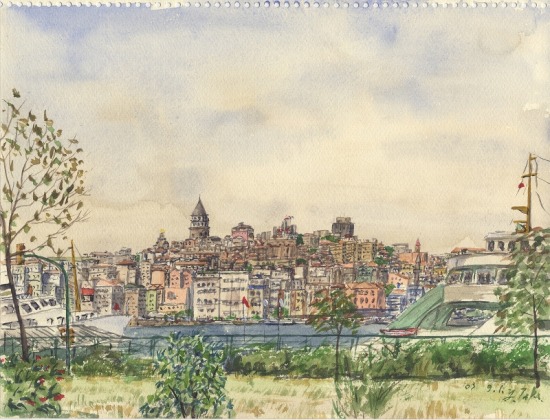 フェリーの発着が忙しいエミノニュ。金角湾越しの新市街をスケッチする。特徴あるガラタ塔ははずせない。 イスタンブールへの滞在は今回で6回目となる。旅の終結点として申し分ない都市だ。