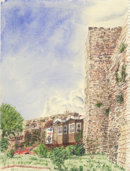 行きつけの食堂で昼を済まして、城壁の外、海側に下ってきた。緑濃い公園から城壁をスケッチする。ここは古びた城壁と古びた民家が残っている。公園一角ではボーリング作業がなされているが、ボーリング櫓や作業機器の類は省略した。