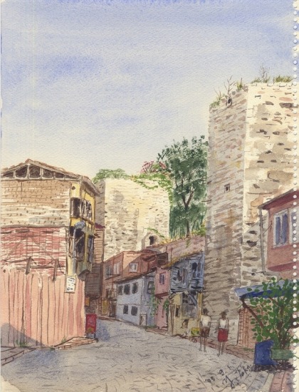 宿で自炊朝食を摂って、スケッチに出た。昨日朝に下見しておいたここをスケッチする。 この道を登っていくと右手にトプカプ宮殿入り口がある。